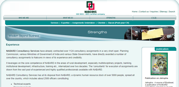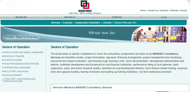 NABARD Consultancy Services (NABCONS) is a wholly owned subsidiary promoted by National Bank for Agriculture and Rural Development (NABARD) and is engaged in providing consultancy in all spheres of agriculture, rural development and allied areas. Nabcons leverages on the core competence of the NABARD in the areas of agricultural and rural development, especially multidisciplinary projects, banking, institutional development, infrastructure, training, etc., internalized for more than two decades.